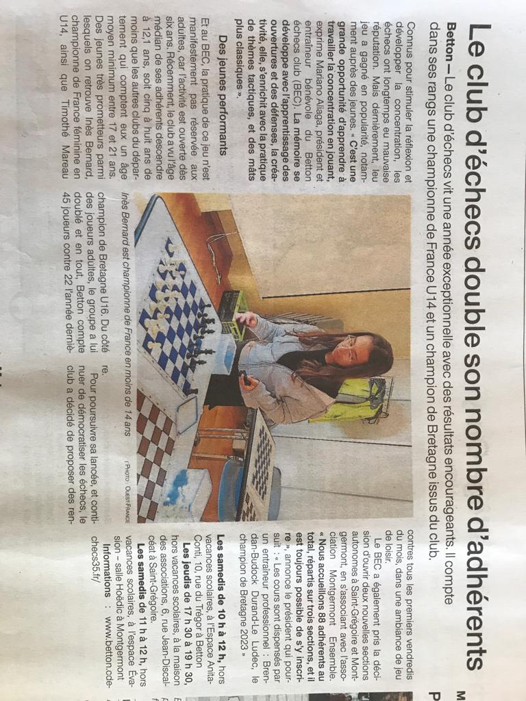 Retrouvez en PJ l'article de Ouest-France "Le Club d'échecs double son nombre d'adhérents".