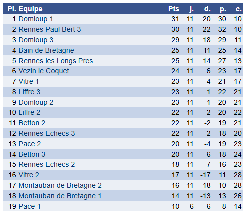 Malgré cette dernière ronde compliquée, Betton 2 termine 11ᵉ sur 19 équipes, un résultat honorable pour une équipe majoritairement composée de jeunes joueurs en apprentissage.