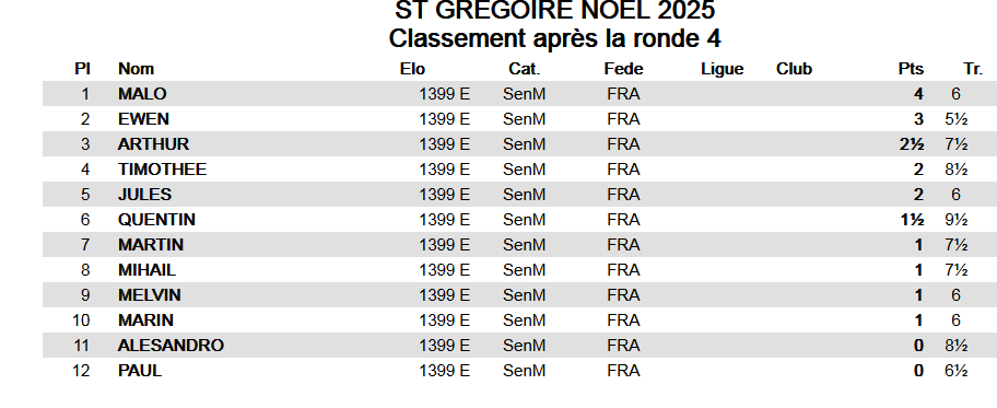 Le tournoi à Saint-Grégoire s’est poursuivi dans une ambiance aussi studieuse que conviviale, avec 12 joueuses et joueurs réunis autour de l’échiquier. Après quatre rondes, un premier bilan se dessine… et le suspense reste bien présent derrière la tête du classement !